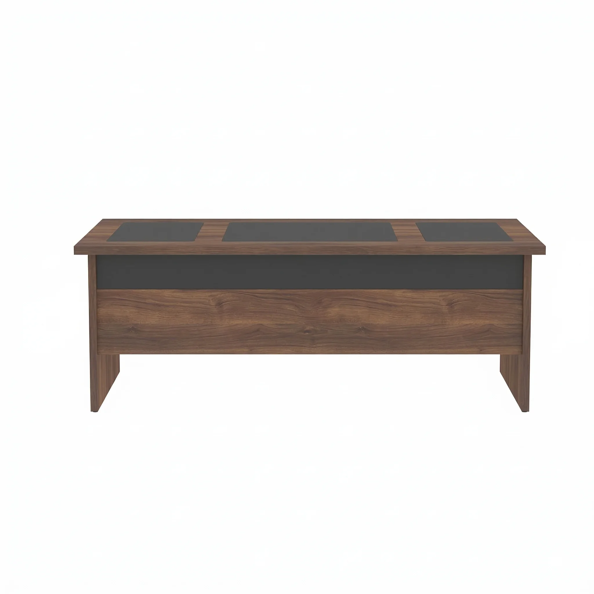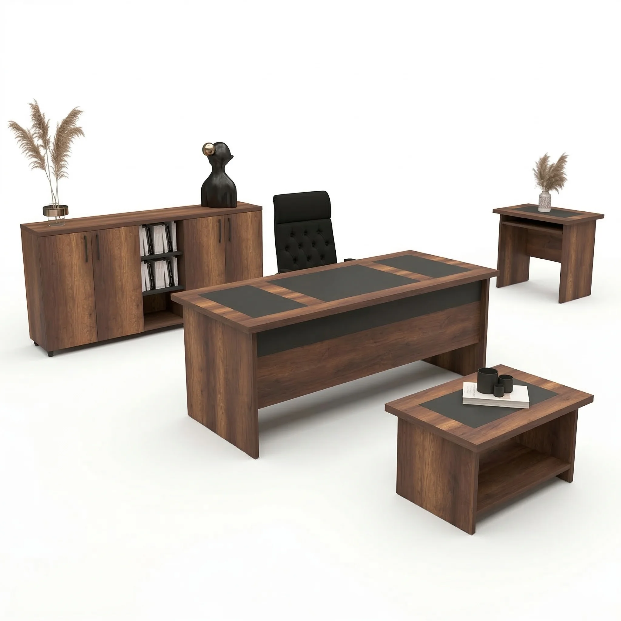 Ofisinizde hem fonksiyonelliği hem de estetiği bir arada sunan Tria 7’li Yönetici Masa Takımı, klasik ahşap dokusunu modern antrasit detaylarla harmanlayarak profesyonel bir çalışma alanı yaratır. Masanın üst yüzeyindeki deri sümen detayları hem prestijli bir görünüm sağlar hem de konforlu bir kullanım sunar. Geniş hacimli dolabı, düzenleyici kesonu ve yardımcı etajeri sayesinde tüm ofis gereçlerinizi elinizin altında tutan bu set, minimalist tasarımıyla modern ofis dekorasyonlarını tamamlayan şık bir çözümdür.